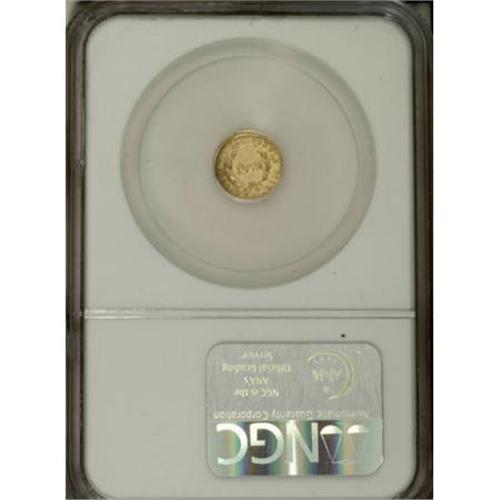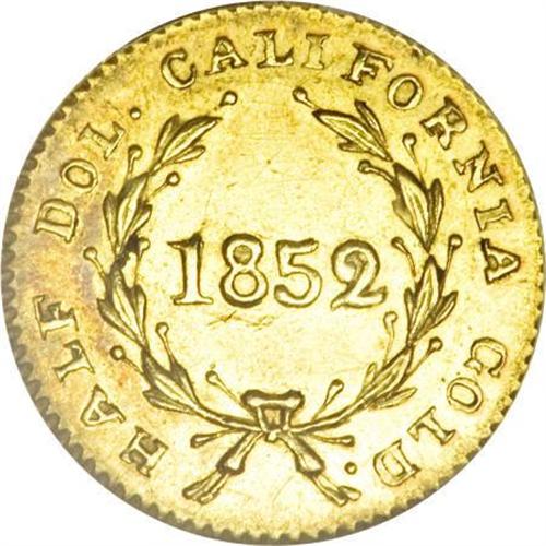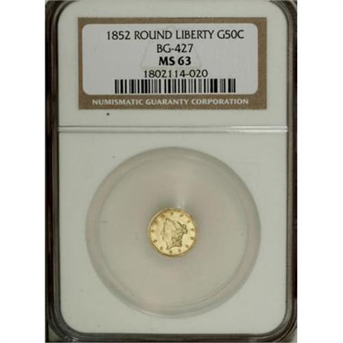 <B>1852 50C Liberty Round 50 Cents, BG-427, Low R.6, MS63 NGC.</B></I> A satiny straw-gold representative with glimpses of russet-brown along the left borders. A thin mark beneath the 8 in the date is barely worthy of mention. Bay area jeweler Antoine Louis Nouizillet was the maker of this challenging Period One variety. Census: 1 in 63, 0 finer (11/07).<BR><BR><b>Shipping:</b> Coins & Currency (<a target="_blank" href="http://www.heritageauctions.com/common/shipping.php">view shipping information</a>)