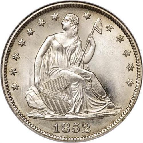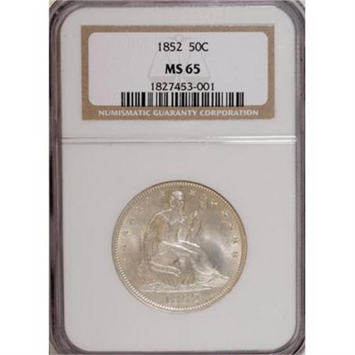 <B>1852 50C MS65 NGC.</B></I> Perhaps the most important observation about this piece is its virtually full strike, with only slight weakness evident on the stars by the head of Liberty. The surfaces have soft mint luster and are mostly untoned with subliminal champagne color. An unusual No Motto half to locate in such high grade. Census: 3 in 65, 4 finer (1/08).<BR><BR><B>Coin Engraver:</B> Christian Gobrecht<BR><BR><b>Shipping:</b> Coins & Currency (<a target="_blank" href="http://www.heritageauctions.com/common/shipping.php">view shipping information</a>)