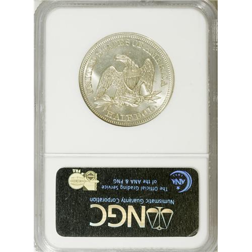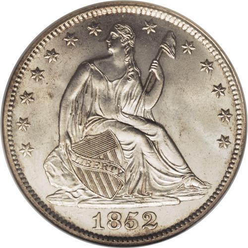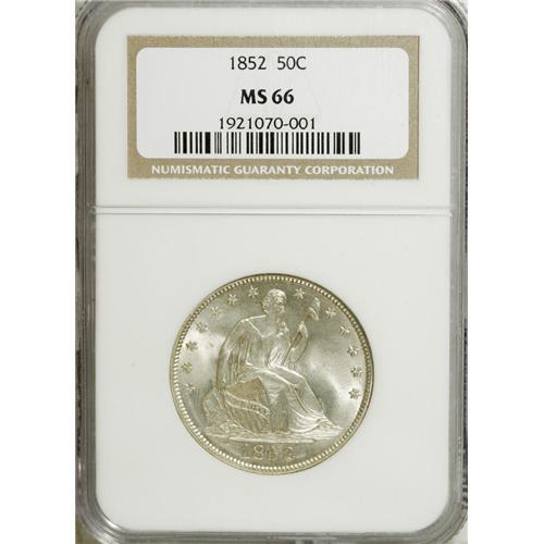 <B>1852 50C MS66 NGC.</B></I> Not only is this an amazing Premium Gem quality representative of the No Motto design, but it is also a low-mintage key date issue that will stimulate the desire of advanced half dollar specialists. All of the design elements on both sides are sharply struck, with weakness evident only on a few of the obverse stars. This is a fully brilliant piece with frosty luster and splashes of light gold color over silver surfaces. Both sides are exquisitely preserved with only the slightest abrasions. Census: 2 in 66, 2 finer (4/07).<BR><BR><b>Shipping:</b> Coins & Currency (<a target="_blank" href="http://www.heritageauctions.com/common/shipping.php">view shipping information</a>)