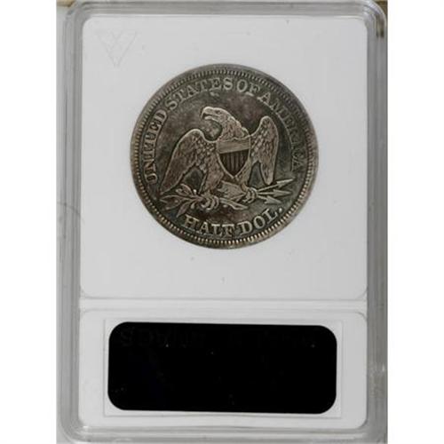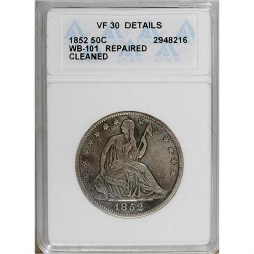 <B>1852 50C --Repaired, Cleaned--ANACS. VF30 Details. </B></I> WB-101. Well detailed with all of the letters in LIBERTY clear and full. An irregular pattern of steel-gray and purple-violet coloration covers each side. A repair has occurred above Liberty's left (facing) shoulder and above HA on the reverse, probably where a hole in the coin was plugged. The piece has a subdued appearance from harsh cleaning. Only 77,130 halves were produced this year, and a great many of those were melted. As a result, examples are scarce in all grades. <BR><BR><b>Shipping:</b> Coins & Currency (<a target="_blank" href="http://www.heritageauctions.com/common/shipping.php">view shipping information</a>)