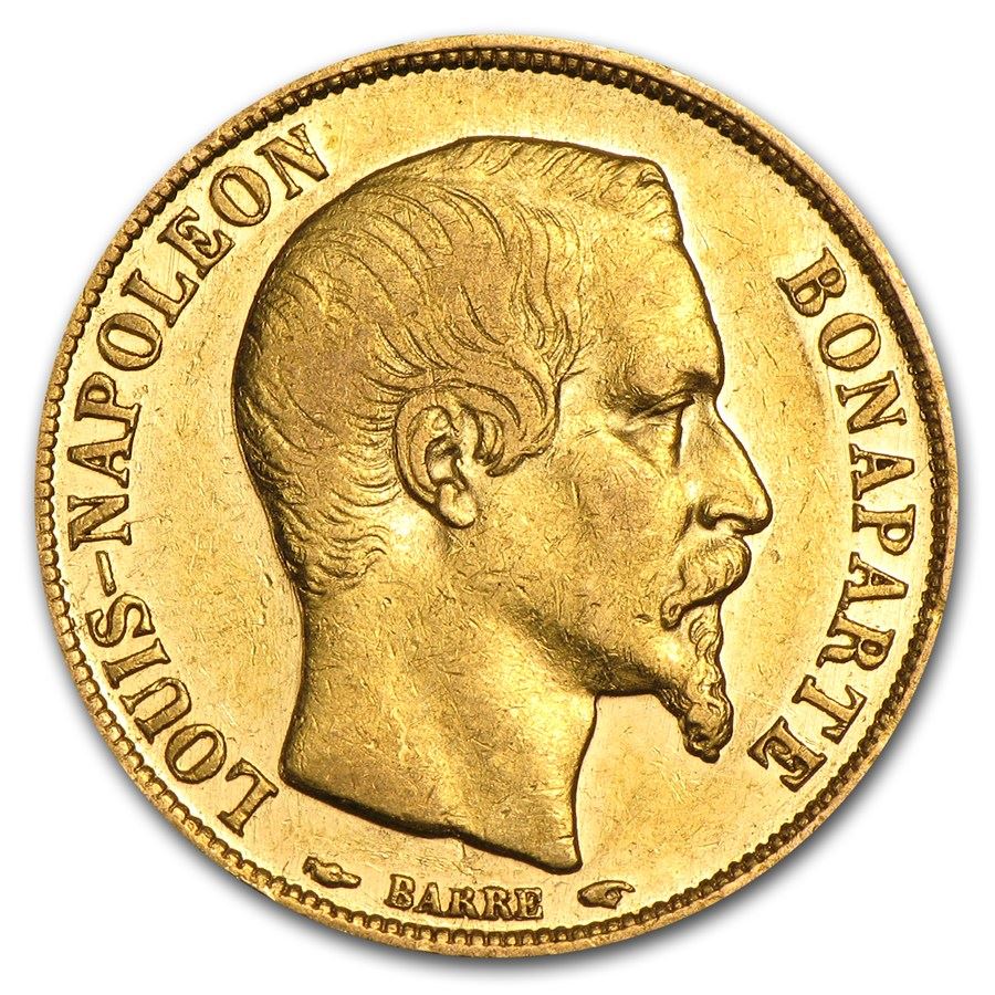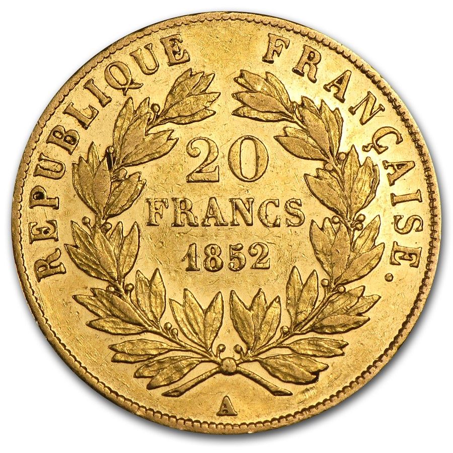 1852-A France Gold 20 Francs Louis Napoleon Avg Circ