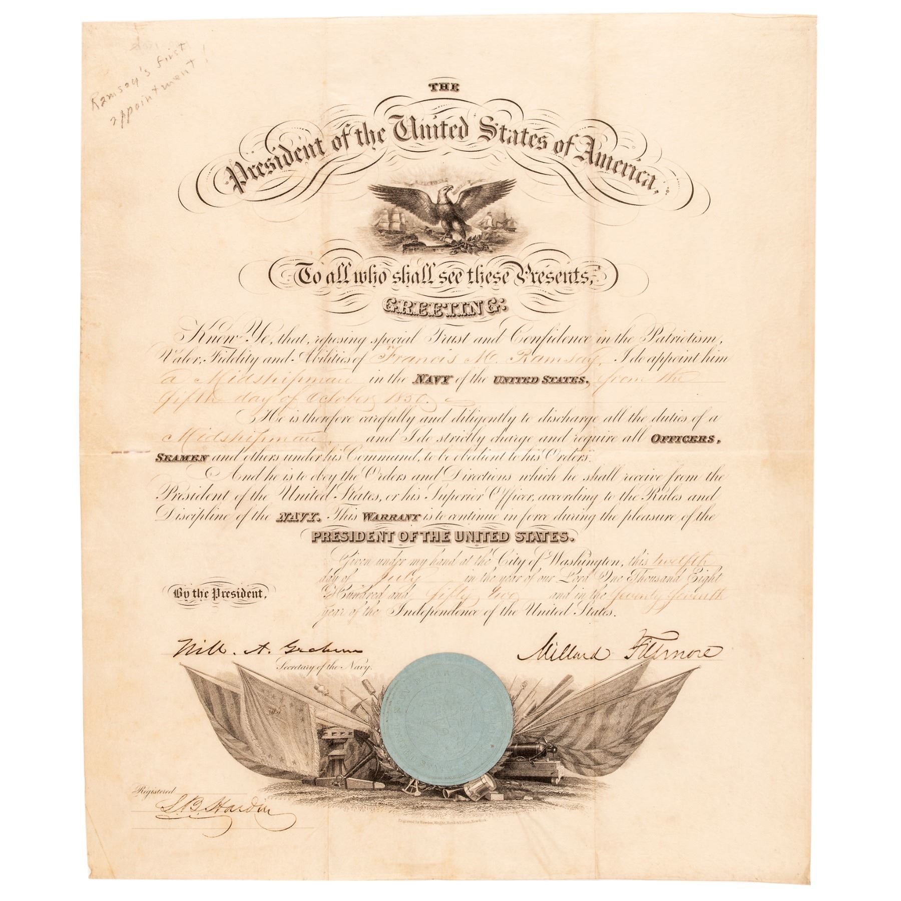 1852 ADM. FRANCIS MUNROE RAMSAYS 1st Naval Commission, MILLARD FILLMORE Signed