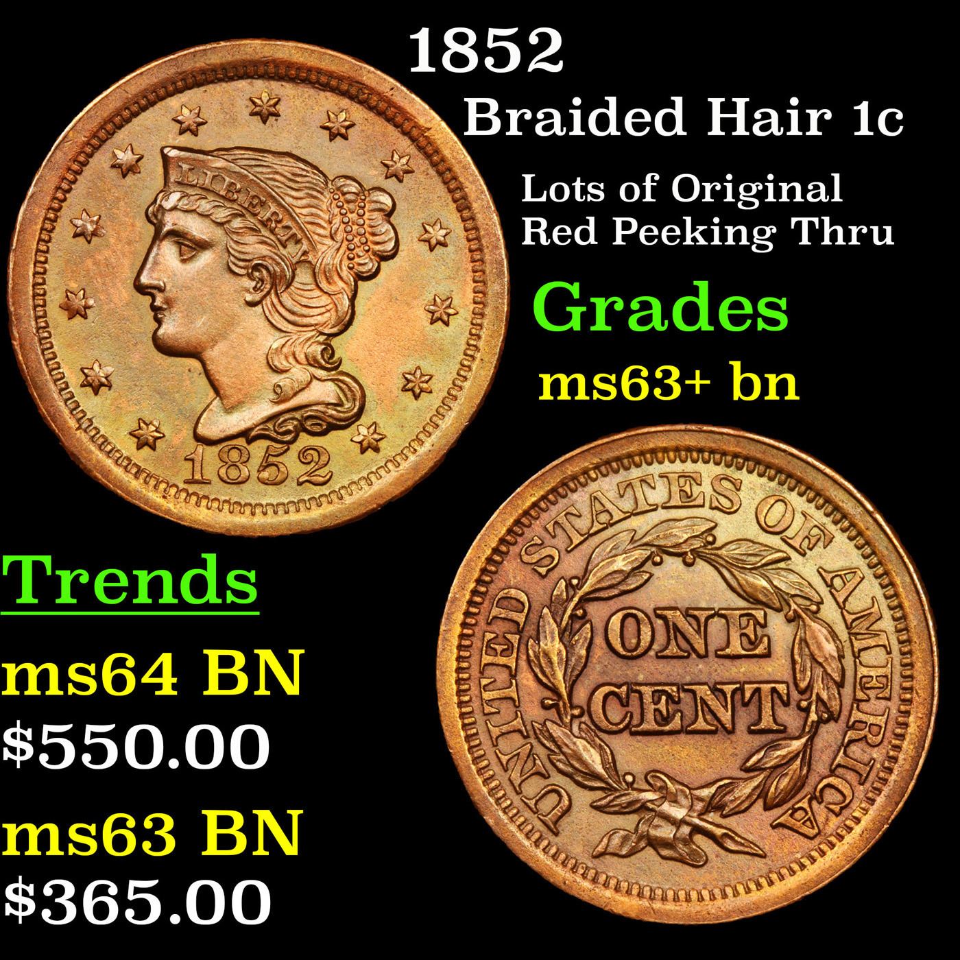 1852 Braided Hair Large Cent 1c Grades Select+ Unc BN.