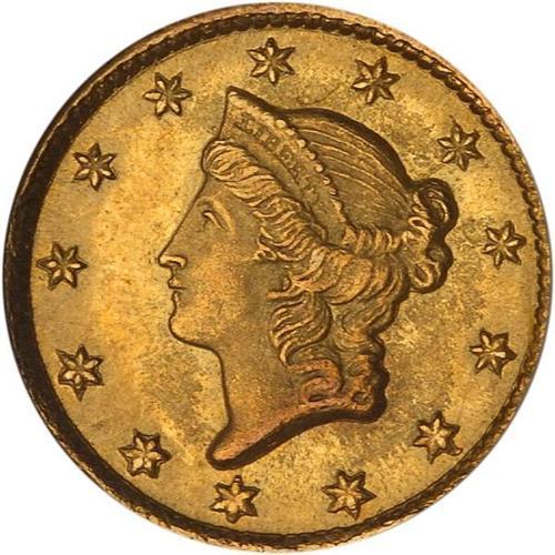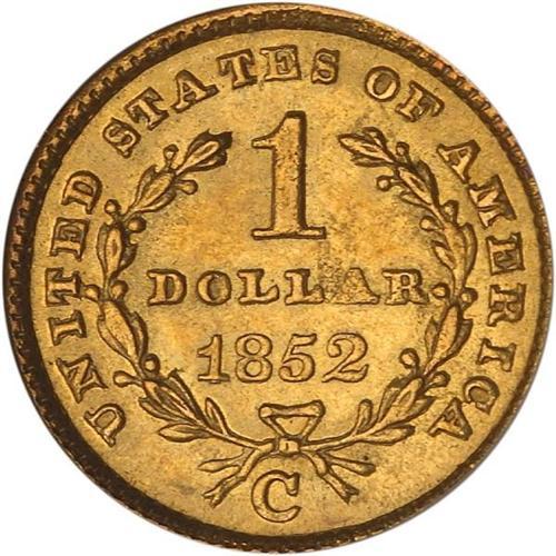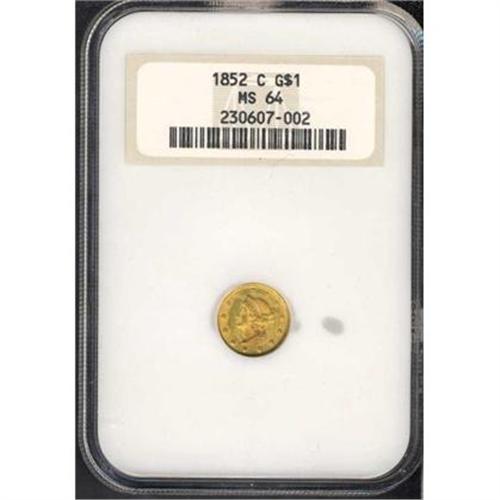<b>1852-C $1 Gold Liberty. NGC graded MS64.</b> Although the mintage is at the upper end for examples from the Charlotte Mint, this issue still causes a shortage in supply in absolute terms, as only 9,434 examples were coined. If 1% survive today, the population in all grades remains under 100 coins, and "all grades" usually means Very Fine or Extremely Fine. Like many similar branch mint rarities, the population figures are overstated due to numerous submissions of a tiny number of coins. NGC has certified only 7 in MS64, with 4 higher as of April 2006, perhaps not more than a coin or two in such strong Mint State quality makes its way onto the market during the span of a year's time. This handsome offering is almost certainly in the Condition Census for the date, one of the 10 finest known examples.