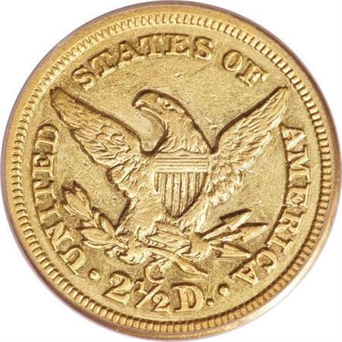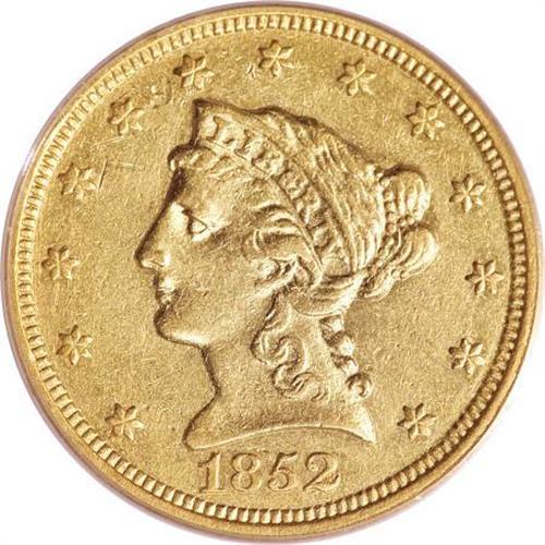 <B>1852-C $2 1/2 AU50 PCGS.</B></I> Variety 14-I. Like most Charlotte Mint quarter eagle issues, the 1852-C has a tiny mintage, and is rare regardless of grade. A mere 9,772 pieces were struck, and survivors with some remaining mint luster are in strong demand from Southern gold specialists. This example has some softness on the eagle's left (facing) leg, but the overall strike is crisp, particularly near the rims. Population: 7 in 50, 27 finer (8/07).<BR><BR><B>Coin Engraver:</B> Christian Gobrecht<BR><BR><b>Shipping:</b> Coins & Currency (<a target="_blank" href="http://www.heritageauctions.com/common/shipping.php">view shipping information</a>)