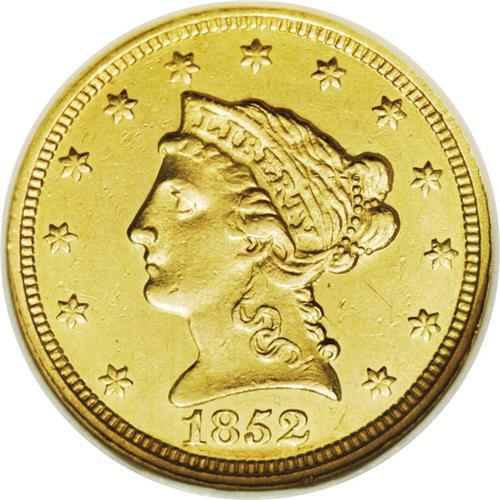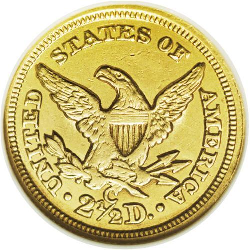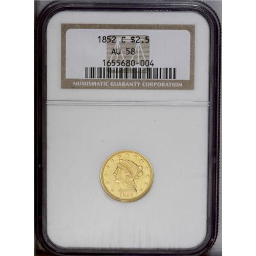 <B>1852-C<$2 1/2> AU58 NGC.</B></I> Variety 14-I. A delightfully clean and attractive piece, one that actually appears more like a P-mint than the incredibly rare C-mint issue that it is. Abundant luster emanates from both sides of this pretty yellow-gold specimen, and only under a loupe do a few small pinscratches appear in the right (facing) obverse field. While the central strike is typical, there is little wear noted, and there are no other mentionable distractions. Few pieces are known in AU, and according to Winter this issue is rarer than all but four other C-mint quarter eagles. This piece is definitely worthy of some serious specialist consideration. Census: 20 in 58, 10 finer (5/06).