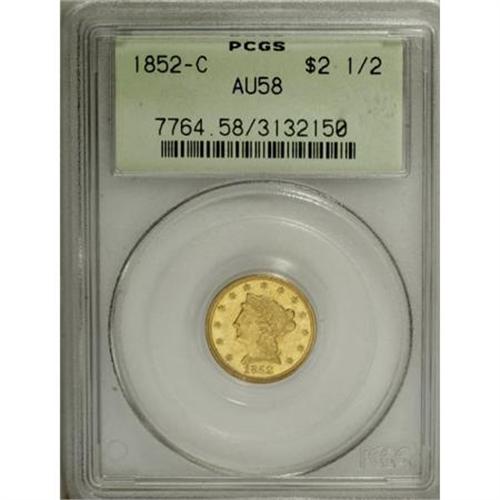 <B>1852-C $2 1/2 AU58 PCGS.</B></I> Variety 14-I. One of the most noteworthy quarter eagles in this collection and it is easily among the finest 1852-C's that I have seen. Even if you have no interest in buying this coin, you should examine it as it is a "poster child" for originality and aesthetic appeal. The strike is considerably sharper than usual with the exception of the centers which have a bit if weakness. Under magnification, some trivial marks can be seen in the obverse fields as well as some minor mint-made roughness. The reverse is absolutely exceptional with the exception of a curly pinscratch below TES in STATES that extends to the eagle's beak. The luster is nearly full and it is quite reflective on the obverse; the reverse is more satiny in its texture. Both sides show raised die finishing lines, indicating that this was probably one of the earliest pieces struck from these dies. The color is sensational with lovely deep green-gold hues seen on both sides. This is the most original 1852-C quarter eagle we have seen and believe that it is clearly Uncirculated by today's standards. It is among the finest known and the only better pieces that we aware of are Bass II: 453 (now graded MS63 by PCGS) and the Elrod coin (graded MS62 by both PCGS and NGC). Housed in an old PCGS holder.<BR> The 1852-C is one of the rarest Charlotte quarter eagles in higher grades. In addition to the two Uncirculated pieces mentioned above, few other exist that might qualify as such. AU examples are seldom offered for sale and many are overgraded, especially when compared to this original coin.<BR><I>From The Carolina Circle Collection.</B></I><BR><BR><B>Coin Engraver:</B> Christian Gobrecht<BR><BR><b>Shipping:</b> Coins & Currency (<a target="_blank" href="http://www.heritageauctions.com/common/shipping.php">view shipping information</a>)