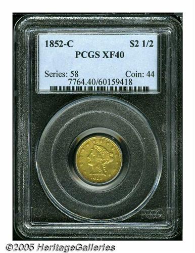 <B>1852-C<$2 1/2> XF40 PCGS.</B></I> Variety 14-I. A glossy tan-brown piece, both sides have faint slide marks but the only contact mark is noted above the coronet tip. Softly defined in the centers, although the wings and the stars are bold. A scant 9,772 pieces were struck.