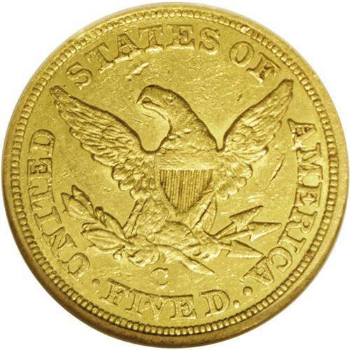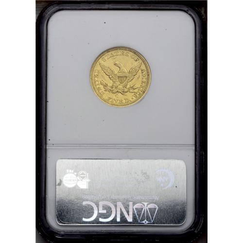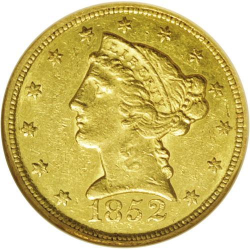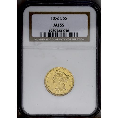 <B>1852-C<$5> AU55 NGC.</B></I> Variety 18-H. The considerable remaining luster exhibits semi-prooflike flash. The strike is somewhat soft in the centers, while elements near the borders are sharp. Thin marks southeast of the shield and near the M in AMERICA are noted for complete accuracy. Suitable for a quality Charlotte gold type set.