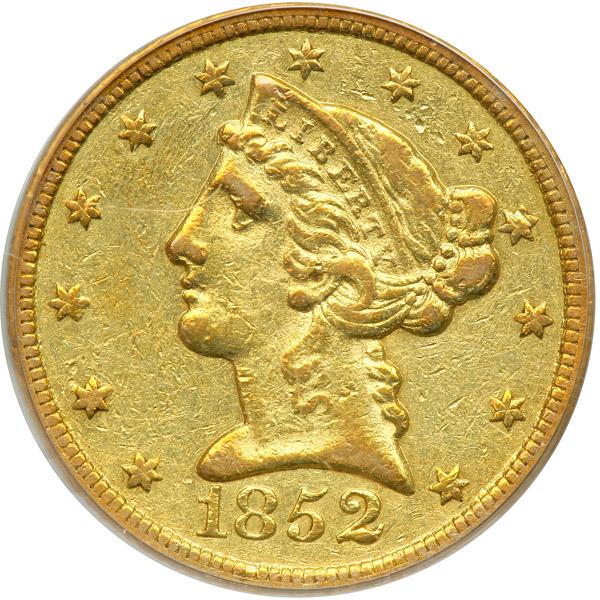 1852-C $5 Liberty. PCGS graded AU-50. Lightly toned and quite attractive. Only 72,574 struck. Some light abrasion marks from circulation show mainly under low magnification. One of the more readily available issues from Charlotte, but still far from plentiful. As such, this would make an excellent candidate in a general type set of half eagles. Pop 24; 61 finer (PCGS # 8251) .