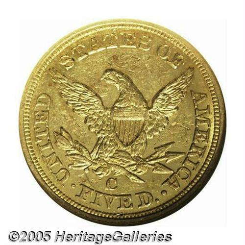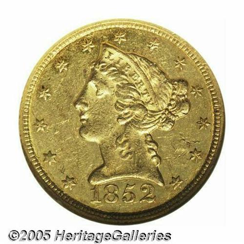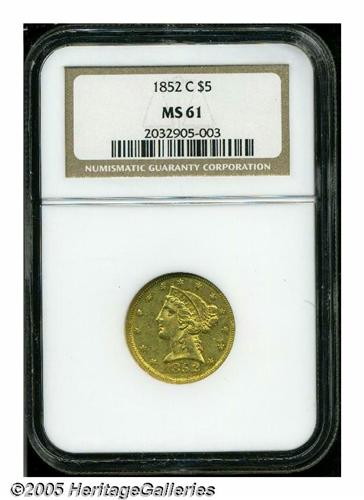 <B>1852-C<$5> MS61 NGC.</B></I> Variety 18-H. A beautiful Charlotte Mint Half Eagle with an original appearance and impressive prooflike luster. A few minor marks do not distract. The strike is good but not quite crisp. Uncirculated C-mint gold is too rare to sate specialist demand. Population: 5 in 61, 15 finer (5/05).