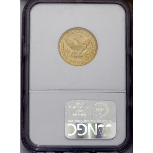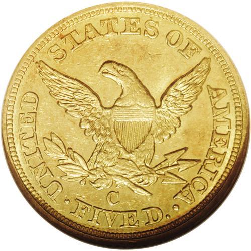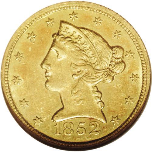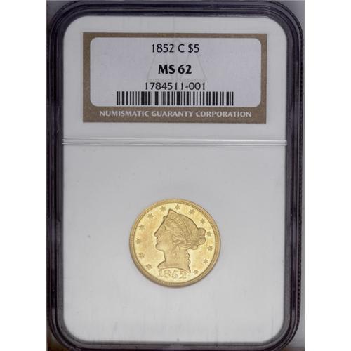 <B>1852-C $5 MS62 NGC.</B></I> Variety 18-H. Attractive green-gold color complements the light orange toning on this example. The 1852-C is one of the more common C-mint issues in high grade, with maybe a dozen or so Uncirculated examples known. The strike is adequate if not impressive, with weakness on Liberty's tresses above the ear, on the eagle's neck, and on the tail feathers. There are light abrasions, none worthy of singling out, and the surfaces are subtly prooflike. Census: 5 in 62, 11 finer (1/06).