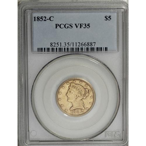 <B>1852-C $5 VF35 PCGS.</B></I> Variety 18-H. This evenly circulated green-gold piece retains noticeable definition on the left (facing) wing and on the shield. A worthy, problem-free Charlotte Mint gold type coin.<BR><BR><b>Shipping:</b> Coins & Currency (<a target="_blank" href="http://www.heritageauctions.com/common/shipping.php">view shipping information</a>)