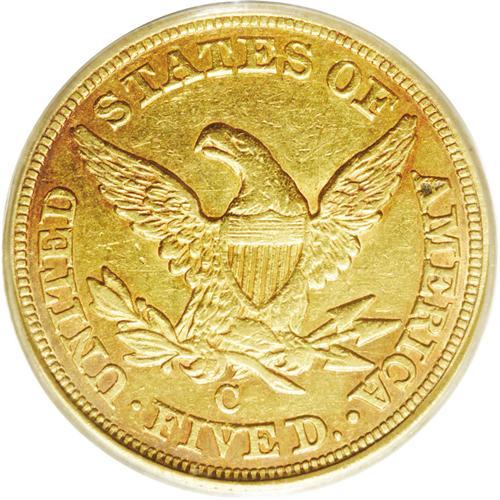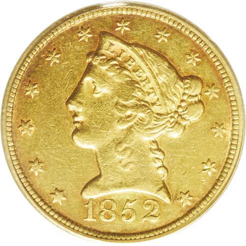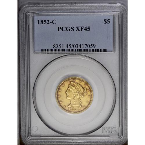 <B>1852-C $5 XF45 PCGS.</B></I> Variety 18-H. Always in demand due to its Charlotte mint origin, this example is bright gold colored in the centers with plum and maroon patina around the obverse and reverse peripheries.<BR><I>From The Carolina Gold Collection, Part Two.</B></I>