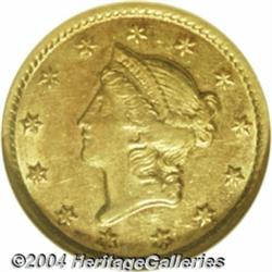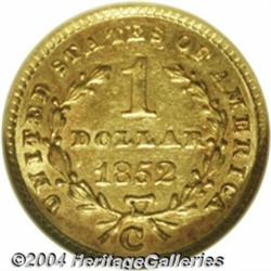 <table><tr><td><table><tr><td>1852-C G$1 AU58 NGC. Variety 7-H. The 1 in the date is repunched south. A richly detailed Gold Dollar with rose and canary-gold color. Ample luster outlines protected areas, and the portrait has only faint rub. A wispy pinscratch near 5 o'clock on the reverse provides the only remotely mentionable contact. A mere 9,434 pieces were struck. <BR><BR><B>Important notice:</B> Heritage usually auctions material at the rate of 200-250 lots per hour. On some occasions eBay Live bid software or the Internet may not be able to keep up with the pace of the auction. We recommend placing a realistic absentee bid now as insurance to avoid disappointment. Occasionally the auctioneer may eliminate or reject an eBay Live bid, and the auctioneer may also reopen a lot after the close of the eBay live bidding (usually because we missed an audience bid), and may reject your bid even if it shows you as the winning bidder. By bidding via eBay Live, you agree that Heritage may award the lot to another bidder at its sole discretion under the circumstances described above or any other reasonable circumstances. Since eBay bids are not shown to us until we open the lot on the floor, we treat those bids just like floor bids. In most cases the floor responds before the eBay bid is presented to us, due to Internet lag time, so for consistency we have made it a policy that floor bids are always considered first over tie eBay live bids. Also please note that all Heritage lots purchased through eBay Live carry a 20% Buyer's Premium. Please make sure you read the Terms and Conditions before you bid. <BR><BR><B>IMPORTANT ANNOUNCEMENT ABOUT RESERVES:</B> Heritage now divulges all reserves on its web site 7 days before every auction. If you want to know whether the reserve on this lot has been met, and if not, what the reserve amount is, please visit this lot page on the HeritageCoin.com web site, or email: bid@HeritageGalleries.com </span></font></td></tr></table></td></tr></table>