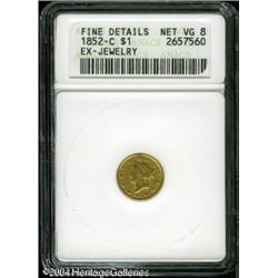 1852-C G$1 --Ex Jewelry--ANACS. Fine Details, Net VG8 <B>1852-C G$1 --Ex Jewelry--ANACS. Fine Details, Net VG8.</B></I> Well worn and quite dull from its "jewelry experience." Just 9,434 pieces were struck, and survivors are still elusive in any condition. <BR><BR><B>Important notice:</B> Heritage usually auctions material at the rate of 200-250 lots per hour. On some occasions eBay Live bid software or the Internet may not be able to keep up with the pace of the auction. We recommend placing a realistic absentee bid now as insurance to avoid disappointment. Occasionally the auctioneer may eliminate or reject an eBay Live bid, and the auctioneer may also reopen a lot after the close of the eBay live bidding (usually because we missed an audience bid), and may reject your bid even if it shows you as the winning bidder. By bidding via eBay Live, you agree that Heritage may award the lot to another bidder at its sole discretion under the circumstances described above or any other reasonable circumstances. Since eBay bids are not shown to us until we open the lot on the floor, we treat those bids just like floor bids. In most cases the floor responds before the eBay bid is presented to us, due to Internet lag time, so for consistency we have made it a policy that floor bids are always considered first over tie eBay live bids. Also please note that all Heritage lots purchased through eBay Live carry a 20% Buyer's Premium. Please make sure you read the Terms and Conditions before you bid. This lot is being auctioned in conjunction with a live floor auction by Heritage Galleries & Auctioneers. All final auction and invoice information will be supplied by Heritage Galleries & Auctioneers, and all other information should be considered preliminary. Lot:6433