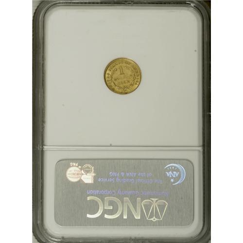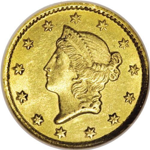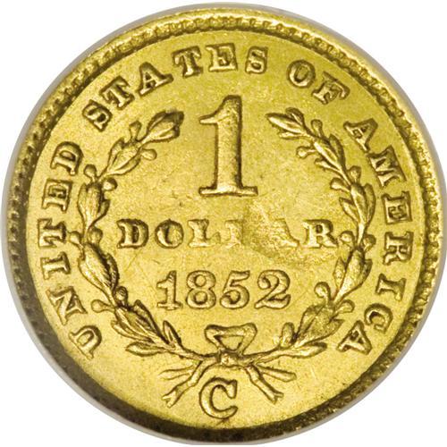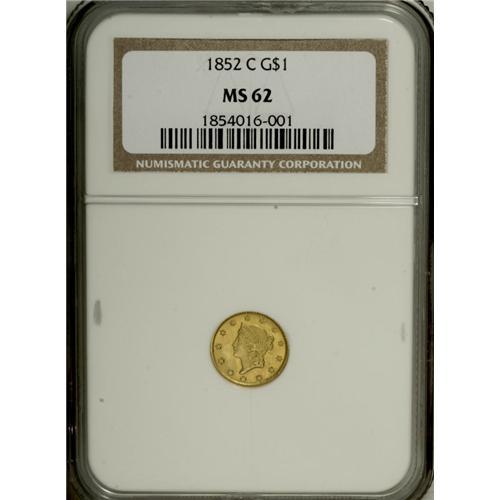 <B>1852-C G$1 MS62 NGC.</B></I> Variety 7-H. A bit weak on some of the highpoints, but satiny and attractive with light green-gold color and few surface marks. Like most 1852-C dollars, it has a noticeable flaw over LA in DOLLAR, which was probably caused by some foreign matter adhering to the die. Census: 23 in 62, 18 finer (2/07).<BR><BR><b>Shipping:</b> Coins & Currency (<a target="_blank" href="http://www.heritageauctions.com/common/shipping.php">view shipping information</a>)