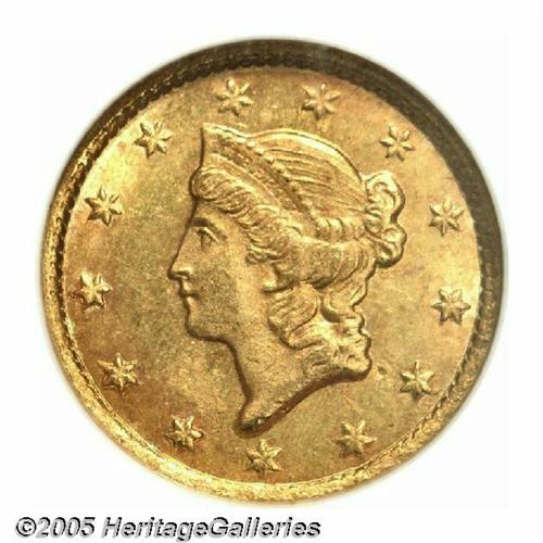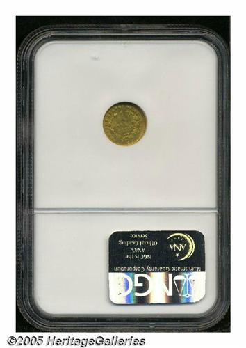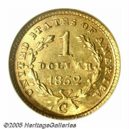 <B>1852-C<G$1> MS64 NGC.</B></I> Variety 7-H. The 1852-C is as scarce as the mintage of 9,434 pieces would indicate. Probably only 80-85 pieces are believed known today in all grades, this and the other MS64 in this sale being among the finest certified. This is a highly lustrous and well defined coin whose central details are also sharp. The curious mint-made foreign matter that is seen in the center of many '52-C quarter eagles is present also on this coin. It begins in the field below the R in DOLLAR and extends up and to the left below the right stand of the 1 in the denomination. Since this is mint caused and seen on many coins of this issue, it does not affect the grade of this coin or its desirability. The only other surface "imperfection" is a tiny planchet flake down and to the right of the back of the truncation of Liberty's neck. Rich red-gold and lilac coloration is seen over each side.