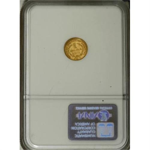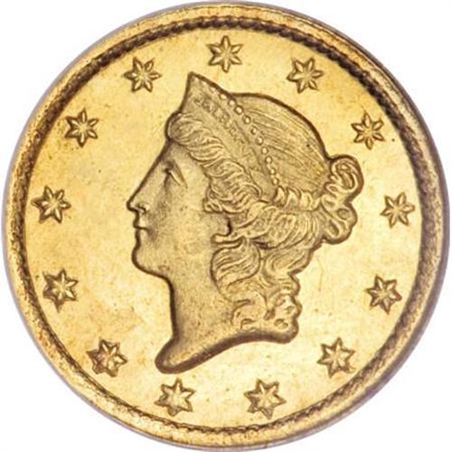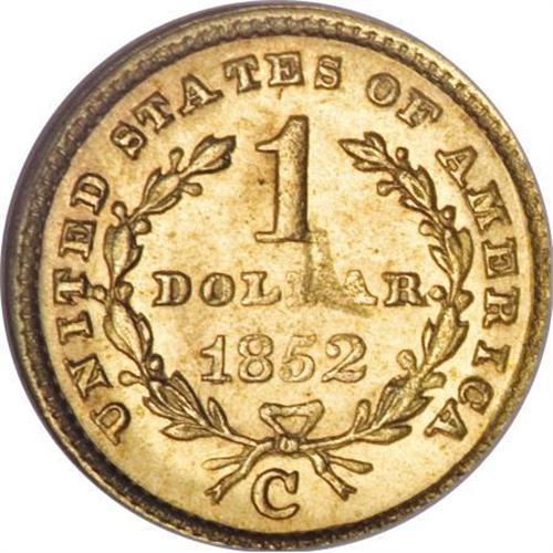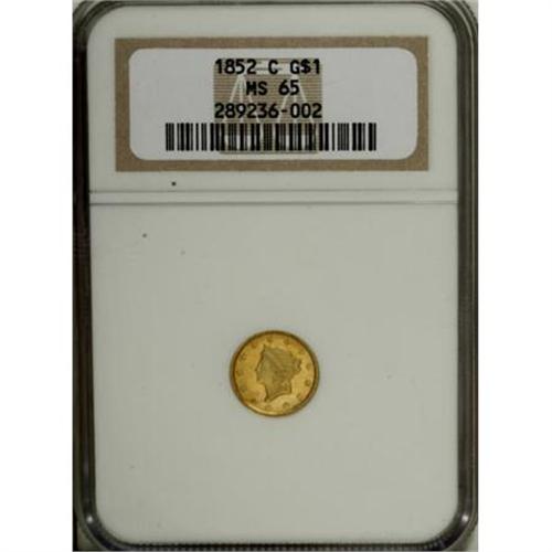 <B>1852-C G$1 MS65 NGC.</B></I> Variety 7-H. This is an impressive Gem representative, and among the finest known survivors of this important Charlotte Mint gold dollar. Only 9,434 examples of this date were coined, and approximately 100 pieces survive in all grades. Like most known survivors, this example has weakness at LA of DOLLAR, appearing similar to a planchet flake but actually a die problem. A small spot of grease or some other foreign matter adhered to the reverse die at the time these pieces were struck. This Gem has frosty green-gold luster with extraordinary design definition. The fields are slightly reflective and the devices are lustrous, creating a cameo appearance. Census: 5 in 65, 1 finer (1/08).<BR><I>From The Southwest Collection.</B></I><BR><BR><B>Coin Engraver:</B> James B. Longacre<BR><BR><b>Shipping:</b> Coins & Currency (<a target="_blank" href="http://www.heritageauctions.com/common/shipping.php">view shipping information</a>)