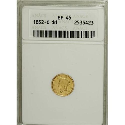 <B>1852-C G$1 XF45 ANACS.</B></I> Variety 7-H. Bright lime-green toning covers each side of this still slightly lustrous example. The striking details are somewhat soft, but no moreso than usual for the Charlotte Mint. A shallow planchet streak extends from beneath the denominational 1 to just below LAR in DOLLAR. A scarce issue from a scant mintage of 9,434 pieces. <BR><BR><B>Coin Engraver:</B> James B. Longacre<BR><BR><b>Shipping:</b> Coins & Currency (<a target="_blank" href="http://www.heritageauctions.com/common/shipping.php">view shipping information</a>)