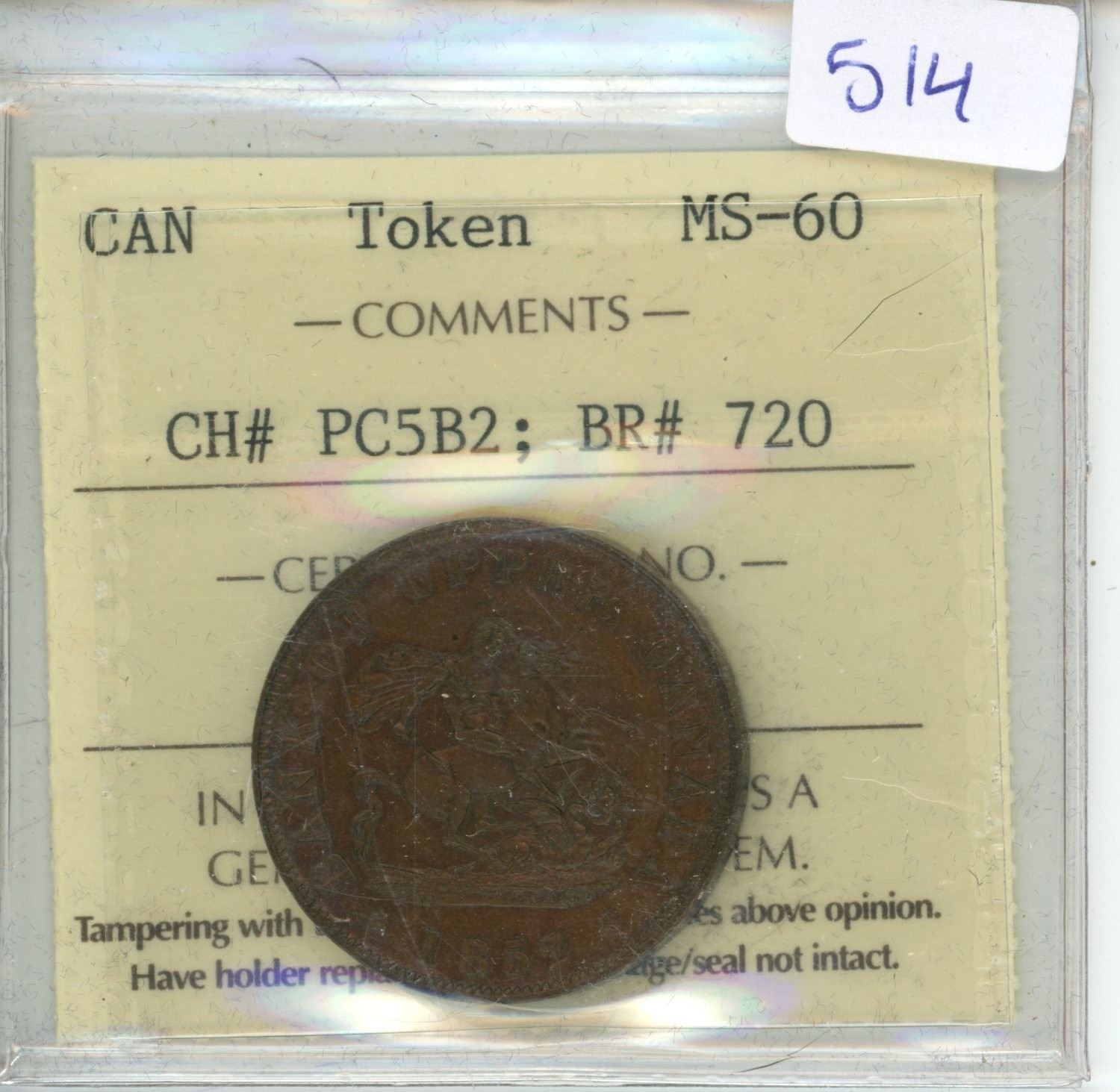 1852 Canadian ICCS Graded Token - MS-60, CH# PC5B2; BR# 720