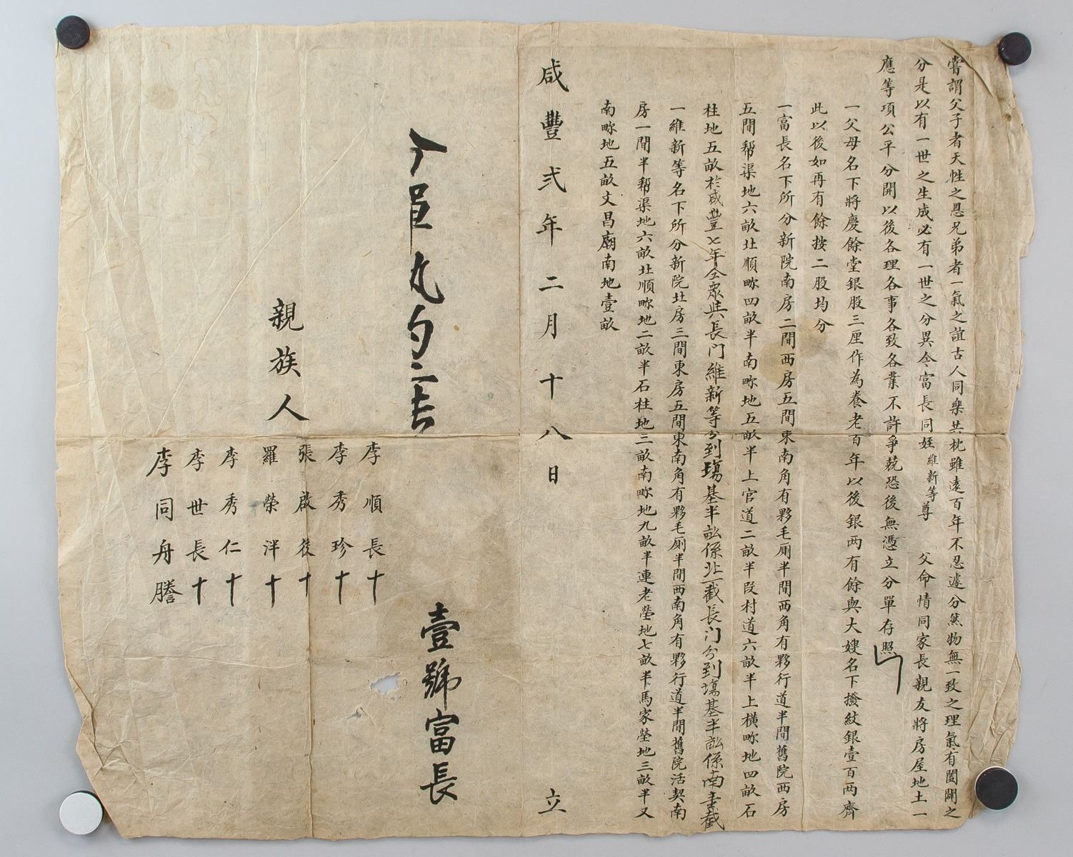 1852 Chinese document, featuring family property divide contract, 47 x 57 cm
