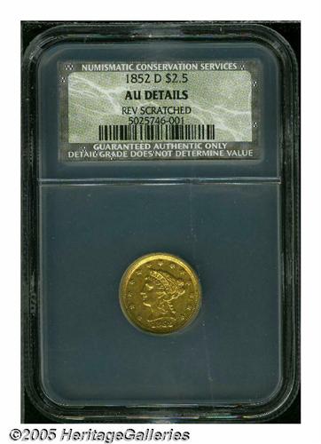 <B>1852-D<$2 1/2> AU50 Details, Reverse Scratched, NCS.</B></I> Variety 15-M. The '52-D is a very scarce issue, with just 4,078 pieces originally produced, and only around 100 survivors are known in all grades. Sharply defined, the surfaces are generally clean except for a large "X" carved into the right reverse field. Light reddish patina is seen over both sides with slight portions of mint luster surrounding the devices.