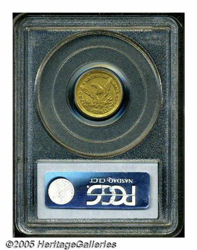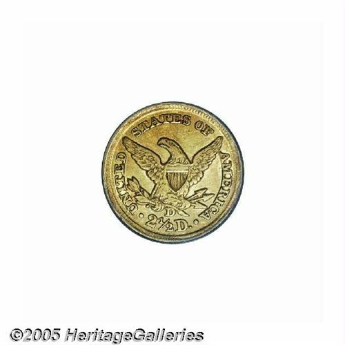 <B>1852-D<$2 1/2> AU55 PCGS.</B></I> Variety 15-M, the only die pairing. The 1852-D is a highly regarded D-mint issue that ranks in the top six Dahlonega Quarter Eagle issues for overall scarcity and is the first in a string of seven rare, low mintage dates from the popular Georgia mint. Only 4,078 pieces were struck in 1852, as mintages for the denomination continued to dwindle in favor of the Half Eagle. This piece is generally sharp save for occasional blurriness on the denticles. Some softness on the highpoints of the eagle's feathers is also noted. A slightly subdued appearance seems to compliment the otherwise sharp details on each side. Population: 9 in 55, 13 finer (5/05).