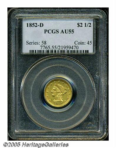1852-D $2 1/2 AU55 PCGS. Variety 15-M, the only d