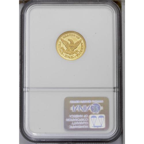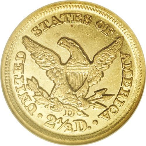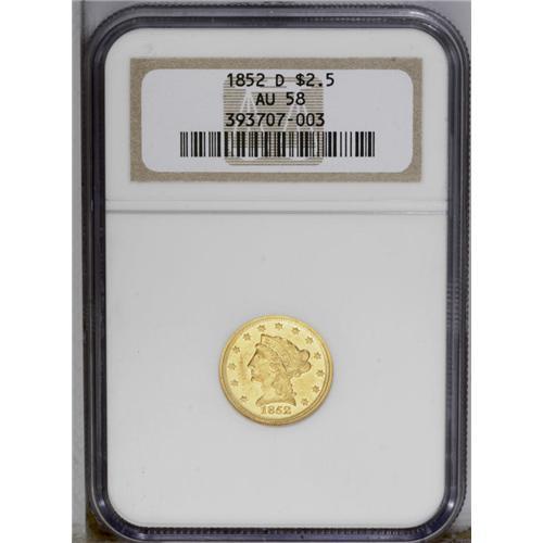 <B>1852-D<$2 1/2> AU58 NGC.</B></I> Variety 15-M. The only variety of the year. A late-date, low mintage issue with only 4,078 pieces struck. The 1852-D is a somewhat problematic date that often shows Mint-made planchet flaws and heavy abrasions. These defects, however, are often compensated by the strength of strike usually found on survivors. This piece does have an especially strong strike, except on the eagle's left (facing) leg. The surfaces are bright with rich reddish-golden coloration. The only planchet flaw that we see is located to up from star 13. Otherwise, the surfaces are lightly abraded. A lovely, vibrant example of this scarce D-mint quarter eagle and just outside the Condition Census. <BR><BR><B>Important notice:</B> Heritage usually auctions material at the rate of 200-250 lots per hour. On some occasions eBay Live bid software or the Internet may not be able to keep up with the pace of the auction. We recommend placing a realistic absentee bid now as insurance to avoid disappointment. Occasionally the auctioneer may eliminate or reject an eBay Live bid, and the auctioneer may also reopen a lot after the close of the eBay live bidding (usually because we missed an audience bid), and may reject your bid even if it shows you as the winning bidder. By bidding via eBay Live, you agree that Heritage may award the lot to another bidder at its sole discretion under the circumstances described above or any other reasonable circumstances. Since eBay bids are not shown to us until we open the lot on the floor, we treat those bids just like floor bids. In most cases the floor responds before the eBay bid is presented to us, due to Internet lag time, so for consistency we have made it a policy that floor bids are always considered first over tie eBay live bids. Also please note that all Heritage lots purchased through eBay Live carry a 20% Buyer's Premium. Please make sure you read the Terms and Conditions before you bid. This lot is being auctioned in conjunction with a live floor auction by Heritage Galleries & Auctioneers. All final auction and invoice information will be supplied by Heritage Galleries & Auctioneers, and all other information should be considered preliminary. Lot:2388 <BR><BR><B>Winning Notification and Billing:</B> After the FINAL session in this auction is complete, Heritage will send e-mail and snail mail invoices. This process normally takes several days. All final auction and invoice information will be supplied by Heritage Galleries & Auctioneers, and all other information should be considered preliminary. <BR><BR>This auction will be conducted on a live auction floor and over the Internet through eBay Live. If you choose to place an absentee bid, please take a moment to <font color='#0000ff'><u><a href='http://pages.ebay.com/liveauctions/help/before/laabsentee.html'>learn how eBay Live absentee bidding works</a></u></font><font color='#000000'>