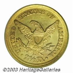 1852-D $2 1/2 MS62 PCGS. Variety 15-M. (per Doug Winter's second edition and revised attribution system). The only die pair used this year. Reverse of 1850-1859.RARITY INFORMATION: Only 4,078 pieces were struck and the 1852-D is one of the half dozen rarest Dahlonega quarter eagles. There are 75-85 pieces known with 15-18 in About Uncirculated and five or six in Uncirculated. The finest is a PCGS MS63 in the Duke's Creek Collection while the second best is a PCGS MS62 (Ex: James Stack) in a Kansas collection. The Green Pond Collection coin is probably the third finest known and it is one of a total of four individual pieces graded as such by PCGS with only one better.STRIKE: Beginning with this issue, the quality of strike for Dahlonega quarter eagles worsens appreciably. However, this coin is quite well impressed. The obverse is completely detailed with no weakness on the hair above the ear. The denticles are full and the stars show complete radial lines. The central reverse is also sharp with full feathers, sharp claws, and full definition on the eagle's right (facing) leg. There is some weakness on the denticles but this is found on every 1852-D quarter eagle.SURFACES: A small, shallow scrape can be seen on the cheekbone of Liberty and there are some light hairlines (not from cleaning) in the obverse fields. With the exception of some minor hairlines, the reverse is very clean with no marks of note. Unlike a number of 1852-D quarter eagles, this piece does not have any black grease stains or copper-hued areas of discoloration. Some removable haze can be seen on the reverse.LUSTER: There appears to be a good deal of original satiny luster on the surfaces, although it is difficult to gauge exactly how much because of the deep color seen on both sides. This issue is sometimes found with very good luster, especially in comparison to other Dahlonega quarter eagles from this era.COLORATION: Vivid orange-gold color can be seen on the obverse and the reverse. This color has almost certainly been added and the appearance could greatly improve if it were carefully removed.EYE APPEAL: While we are not enamored with the (current) color of this coin, it has the potential to possess excellent eye appeal if carefully conserved. It does show exceptional detail and appears to have clean surfaces and good luster. It is still among the finest known 1852-D quarter eagles and is a very important coin for the specialist.COMPARABLES: We sold a PCGS MS62 in our January 2003 auction as lot 4696 and this coin realized $20,700. Another PCGS MS62 sold as lot 454 in the Bowers and Merena October 1999 Bass II Sale where it realized $25,300. In the 1999 FUN Sale, we sold yet another PCGS MS62 as lot 7651 where it realized $28,750.PEDIGREE: Purchased from Doug Winter and Lee Minshull in July 1999; earlier in a North Carolina collection and purchased directly from the Stack's January 1993 auction where it was lot 1650. This is the plate coin in the second edition of the Winter book and it is listed in the current Condition Census as being tied for second finest known. Important notice: Heritage usually auctions material at the rate of 200-250 lots per hour. On some occasions eBay Live bid software or the Internet may not be able to keep up with the pace of the auction. We recommend placing a realistic absentee bid now as insurance to avoid disappointment. Occasionally the auctioneer may eliminate or reject an eBay Live bid, and the auctioneer may also reopen a lot after the close of the eBay live bidding (usually because we missed an audience bid), and may reject your bid even if it shows you as the winning bidder. By bidding via eBay Live, you agree that Heritage may award the lot to another bidder at its sole discretion under the circumstances described above or any other reasonable circumstances. Also please note that all Heritage lots purchased through eBay Live carry a 20% Buyer's Premium. Please make sure you read the Terms and Conditions before you bid.
