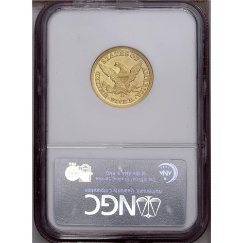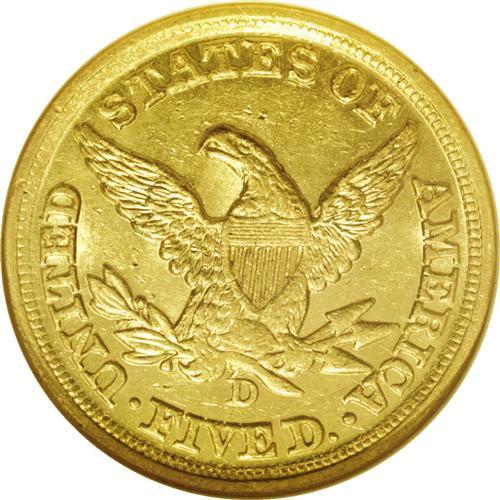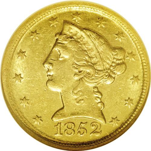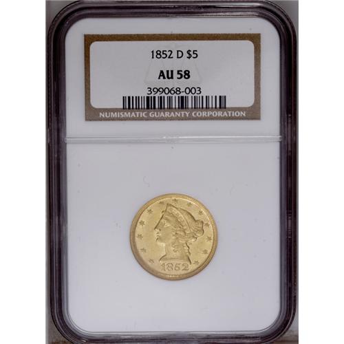 <B>1852-D $5 AU58 NGC.</B></I> Variety 28-U. One of three identified die marriages for the issue, the date is centered beneath bust, and a vertical line is present in the second S in STATES. As usual for the Dahlonega Mint, the strike is not complete on the curls, claws, or fletchings, but the wings are intricate, and there is no obvious friction on the devices. Luster is extensive but does not cross the open fields. Tiny ticks on the forehead and nose are not significant for the grade.