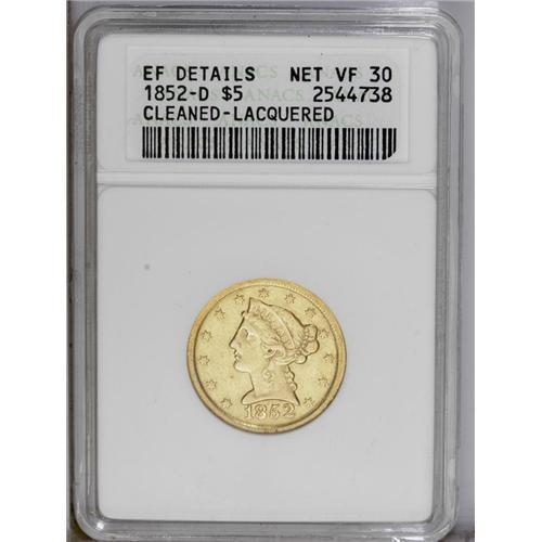 <B>1852-D<$5>--Cleaned, Lacquered--ANACS. XF Details, Net VF30.</B></I> Variety 28-U. A few light hairlines are noted behind Liberty's neck, but the piece is only mildly cleaned. Translucent ice-blue lacquer residue outlines device elements. The strike is soft on Liberty's curls and the eagle's fletchings, as usual for the mint.<BR><I>From The Steve Glenn Collection.</B></I> <BR><BR><B>Important notice:</B> Heritage usually auctions material at the rate of 200-250 lots per hour. On some occasions eBay Live bid software or the Internet may not be able to keep up with the pace of the auction. We recommend placing a realistic absentee bid now as insurance to avoid disappointment. Occasionally the auctioneer may eliminate or reject an eBay Live bid, and the auctioneer may also reopen a lot after the close of the eBay live bidding (usually because we missed an audience bid), and may reject your bid even if it shows you as the winning bidder. By bidding via eBay Live, you agree that Heritage may award the lot to another bidder at its sole discretion under the circumstances described above or any other reasonable circumstances. Since eBay bids are not shown to us until we open the lot on the floor, we treat those bids just like floor bids. In most cases the floor responds before the eBay bid is presented to us, due to Internet lag time, so for consistency we have made it a policy that floor bids are always considered first over tie eBay live bids. Also please note that all Heritage lots purchased through eBay Live carry a 20% Buyer's Premium. Please make sure you read the Terms and Conditions before you bid. This lot is being auctioned in conjunction with a live floor auction by Heritage Galleries & Auctioneers. All final auction and invoice information will be supplied by Heritage Galleries & Auctioneers, and all other information should be considered preliminary. Lot:2710 <BR><BR><B>Winning Notification and Billing:</B> After the FINAL session in this auction is complete, Heritage will send e-mail and snail mail invoices. This process normally takes several days. All final auction and invoice information will be supplied by Heritage Galleries & Auctioneers, and all other information should be considered preliminary. <BR><BR>This auction will be conducted on a live auction floor and over the Internet through eBay Live. If you choose to place an absentee bid, please take a moment to <font color='#0000ff'><u><a href='http://pages.ebay.com/liveauctions/help/before/laabsentee.html'>learn how eBay Live absentee bidding works</a></u></font><font color='#000000'>
