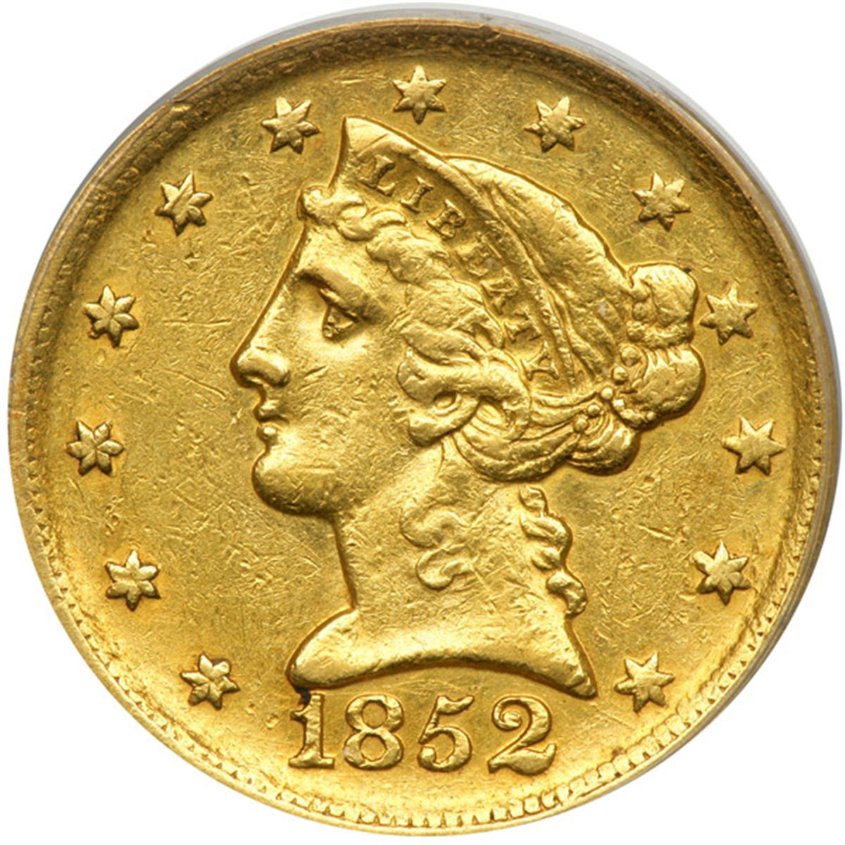 1852-D $5 Liberty. PCGS graded AU-50. A bold strike with moderate marks on both sides; nevertheless, bright and untoned. Only 91,584 minted of which merely 300 examples are estimated to have survived. Pop 24; 48 finer (PCGS # 8252) .