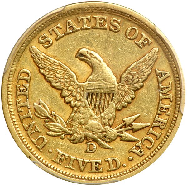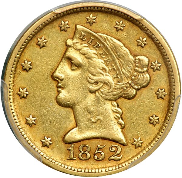 1852-D $5 Liberty. PCGS graded EF-45. Light golden toning. Clean surfaces with some residual luster; moderate weakness on the eagle as often seen. The 1852-D is among the more available Dahlonega half eagles. However, it is a much more elusive coin in top grades than such issues as the 1853-D and the 1854-D (PCGS # 8252) .