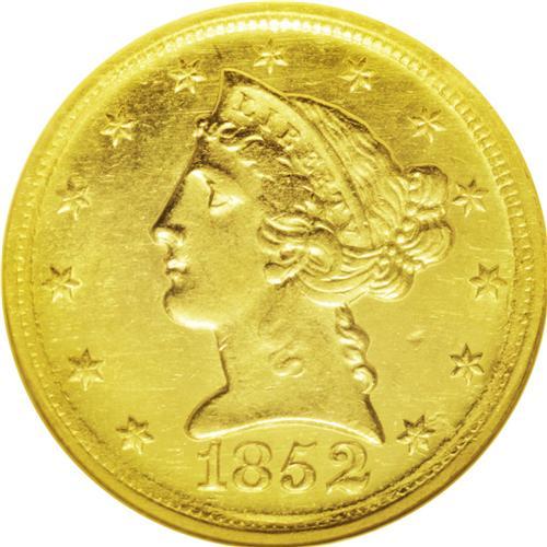 <B>1852-D<$5> MS62 NGC.</B></I> Variety 28-U. This obverse has the date properly centered below the bust, and the reverse has a vertical die line at the upper right of the final S. It is a fully lustrous lemon-yellow example with greenish tendencies. The surfaces on both sides are lightly abraded, consistent with the grade. The central obverse and reverse have weakened design motifs; the eagle's neck is completely flat, for example. Over the years we have only handled a handful of Mint State examples of this date, that total limited to less than 10 pieces. Census: 3 in 62, 3 finer (5/06).