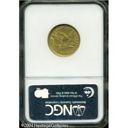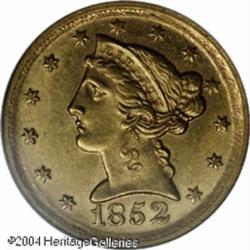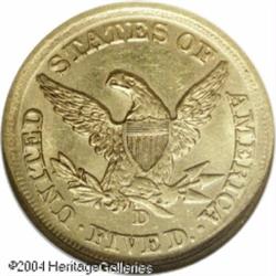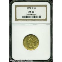 1852-D $5 MS63 NGC. Variety 28-T. Exceptional qual <B>1852-D $5 MS63 NGC.</B></I> Variety 28-T. Exceptional quality for the date and grade with a far better overall strike than usually seen. The obverse shows exquisite, rich, natural orange-gold and coppery hues; the reverse has lighter but equally appealing orange-gold and yellow shadings. There is a thin vertical scratch across Liberty's cheek, this being mentioned as a future identifier. The 1852-D is one of the most common Dahlonega Half Eagles, however, it is much scarcer in Mint State than has been assumed in the past. At the Select level, it is among the Condition Census for the date with only five specimens at this grade level at both services, combined (11/04). None are finer. <BR><BR><B>Important notice:</B> Heritage usually auctions material at the rate of 200-250 lots per hour. On some occasions eBay Live bid software or the Internet may not be able to keep up with the pace of the auction. We recommend placing a realistic absentee bid now as insurance to avoid disappointment. Occasionally the auctioneer may eliminate or reject an eBay Live bid, and the auctioneer may also reopen a lot after the close of the eBay live bidding (usually because we missed an audience bid), and may reject your bid even if it shows you as the winning bidder. By bidding via eBay Live, you agree that Heritage may award the lot to another bidder at its sole discretion under the circumstances described above or any other reasonable circumstances. Since eBay bids are not shown to us until we open the lot on the floor, we treat those bids just like floor bids. In most cases the floor responds before the eBay bid is presented to us, due to Internet lag time, so for consistency we have made it a policy that floor bids are always considered first over tie eBay live bids. Also please note that all Heritage lots purchased through eBay Live carry a 20% Buyer's Premium. Please make sure you read the Terms and Conditions before you bid. This lot is being auctioned in conjunction with a live floor auction by Heritage Galleries & Auctioneers. All final auction and invoice information will be supplied by Heritage Galleries & Auctioneers, and all other information should be considered preliminary. Lot:6649