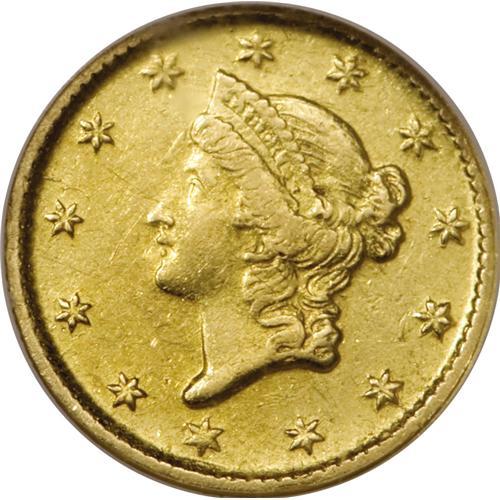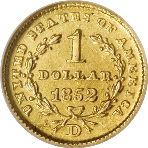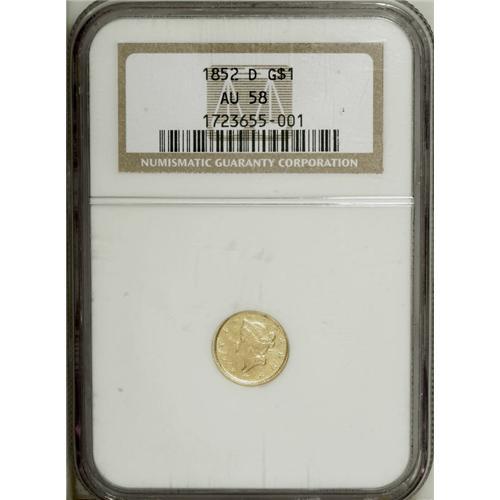 <B>1852-D G$1 AU58 NGC.</B></I> Variety 4-F, the only known variety. This low mintage issue of 6,360 pieces is surpassed by only the 1850-D and 1854-D in terms of overall rarity, among Type One gold dollars. This barely circulated representative appears to be from a similar die state to the example plated in Doug Winter's 1997 book <I>Gold Coins of the Dahlonega Mint: 1838-1861.</B></I> The bridge of Liberty's nose is incomplete from die polishing, and there are moderate to heavy clash marks in the left obverse field. Winter describes this as an intermediate die state. Bright yellow-gold color envelops both sides with a somewhat subdued appearance. There are some light and moderate abrasions scattered about, but the diagnostic die scratch (also as struck) in the reverse field after the A in AMERICA should not be confused with a post-production distraction.<BR><I>From The Frank J. McCarthy Jr. Collection.</B></I><BR><BR><b>Shipping:</b> Coins & Currency (<a target="_blank" href="http://www.heritageauctions.com/common/shipping.php">view shipping information</a>)
