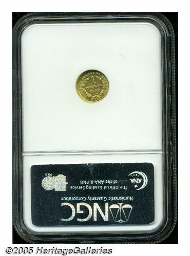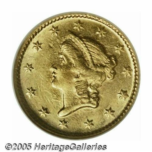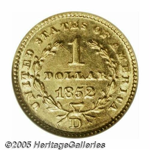 <B>1852-D<G$1> MS61 NGC.</B></I> Variety 4-F. The first thing that is noticed about this lovely coin are the heavy and confused clash marks on the obverse, surrounded the portrait of Liberty. These give the appearance of surface roughness, which is actually not the case. The vast majority of this issue have similar clash marks on the obverse. The distinct minority survive in Mint State, or even close to Mint State condition. Both sides have bright yellow-gold luster with only minor surface imperfections. A couple faint scratches at the upper left obverse undoubtedly kept this example from a higher grade. Even one more grade point would make a substantial difference, as the finest certified by NGC is only MS63. Population: 15 in 61, 10 finer (4/05).
