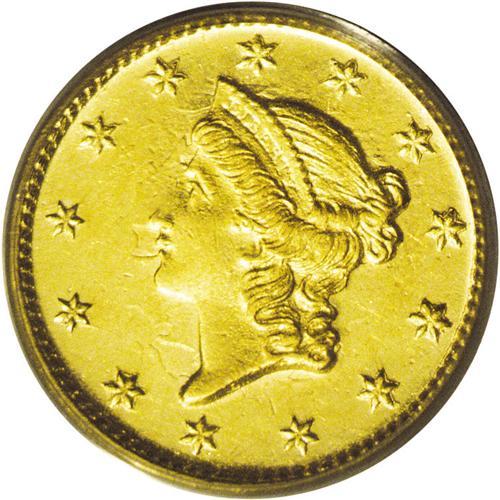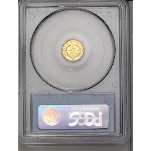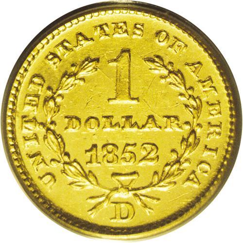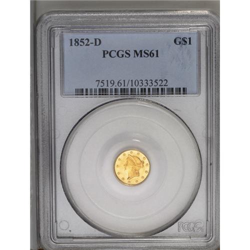 <B>1852-D<G$1> MS61 PCGS.</B></I> Variety 4-F. Although the Dahlonega Mint produced more than 90,000 half eagles in 1852, its mintage of gold dollars that year was limited to 6,360 pieces. This intricately struck and bright canary-gold example has a few minor marks near DOLLAR. Struck from a clashed obverse die. Population: 6 in 61, 2 finer (6/06).