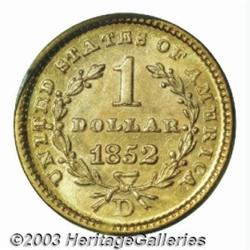 1852-D G$1 MS62 PCGS. Variety 4-F. (per Doug Winter's second edition and revised attribution system). Struck from a clashed and lapped obverse die with the "broken nose" effect on Liberty clearly visible. Heavy date and mintmark; die scratch (?) to the right of the final A in AMERICA, as always. A number of light cracks can be seen on the reverse.RARITY INFORMATION: The 1852-D is one of the rarer Type One gold dollars from this mint. Of the 100 to 110 pieces that are estimated to exist, approximately seven to nine examples are Uncirculated. The finest of these are two or three coins that are graded Mint State 62 by today's standards.STRIKE: The obverse is quite well detailed with full hair curls and radial lines noted. The denticles are nearly complete as well. On the reverse, the detail is excellent with a strong date, mintmark, and wreath. Each denticle is separate and distinct.SURFACES: What appears to be roughness on the obverse is actually the presence of multiple clashmarks. There is some die swelling around the face of Liberty and a crescent of unevenness in this area as made. A number of raised die scratches on the reverse could easily be confused with hairlines, but these are characteristic of the issue. There are a few light marks visible below DOLLAR.LUSTER: The luster shows a distinctive grainy texture that is more pronounced on the obverse than on the reverse. Most 1852-D dollars are very dull and lifeless. This piece has much greater vibrancy than normal.COLORATION: Light to medium orange-gold hues can be seen on the obverse and the reverse.EYE APPEAL: The 1852-D is one of the more difficult Type One Dahlonega gold dollars to locate with good eye appeal. The Green Pond example shows a better than average strike, good luster, and pleasing color. The roughness in the obverse fields is diagnostic of the issue and should not reduce this important coin's overall level of eye appeal.COMPARABLES: In September 1997, we sold another PCGS MS62 example for $18,400. In our 1999 FUN auction, a PCGS MS61 was bid to $12,650 while a second MS61 example in that sale brought $8,510.PEDIGREE: Ex: Heritage Rare Coin Galleries, circa 1999. This is the plate coin in the second edition of Doug Winter's reference on the series and it is listed in the Condition Census as the third finest known. Important notice: Heritage usually auctions material at the rate of 200-250 lots per hour. On some occasions eBay Live bid software or the Internet may not be able to keep up with the pace of the auction. We recommend placing a realistic absentee bid now as insurance to avoid disappointment. Occasionally the auctioneer may eliminate or reject an eBay Live bid, and the auctioneer may also reopen a lot after the close of the eBay live bidding (usually because we missed an audience bid), and may reject your bid even if it shows you as the winning bidder. By bidding via eBay Live, you agree that Heritage may award the lot to another bidder at its sole discretion under the circumstances described above or any other reasonable circumstances. Also please note that all Heritage lots purchased through eBay Live carry a 20% Buyer's Premium. Please make sure you read the Terms and Conditions before you bid.