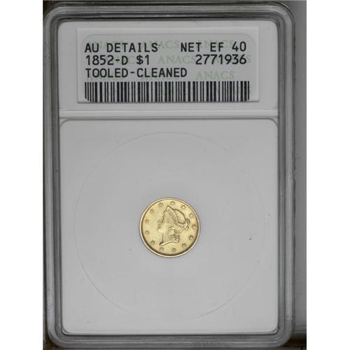 <B>1852-D G$1 --Tooled, Cleaned--ANACS. AU Details, Net XF40.</B></I> Variety 4-F. Virtually Mint State in terms of sharpness, this rare date Dahlonega Gold Dollar has an impressive strike and no apparent marks. The reverse has short radial die cracks at 2, 5, 7, and 11 o'clock. The curiously smooth fields are minutely granular.