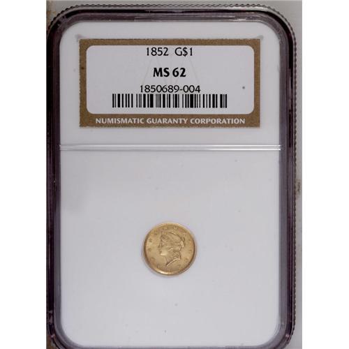 1852 G$1 MS62 NGC. A few wispy, hair-thin marks in the
