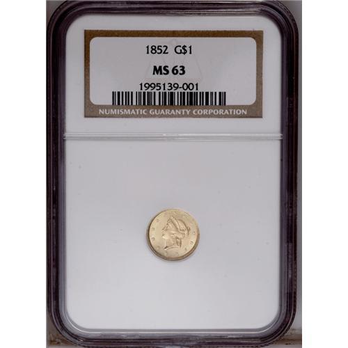 <B>1852<G$1> MS63 NGC.</B></I> A lustrous straw-gold type coin with an above average strike in the centers. A few light field marks are noted, the most apparent approaches the D in DOLLAR.
