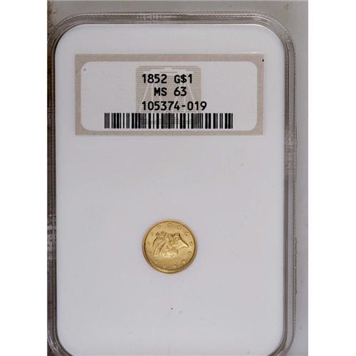 <B>1852<G$1> MS63 NGC.</B></I> This needle-sharp Type One gold dollar has potent luster and pleasing preservation. Bright canary-gold color confirms the eye appeal. Certified in a prior generation holder.