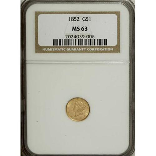 <B>1852 G$1 MS63 NGC.</B></I> Full luster with attractive orange-gold coloration. A few light ticks and grazes limit the grade.<BR><BR><b>Shipping:</b> Coins & Currency (<a target="_blank" href="http://www.heritageauctions.com/common/shipping.php">view shipping information</a>)