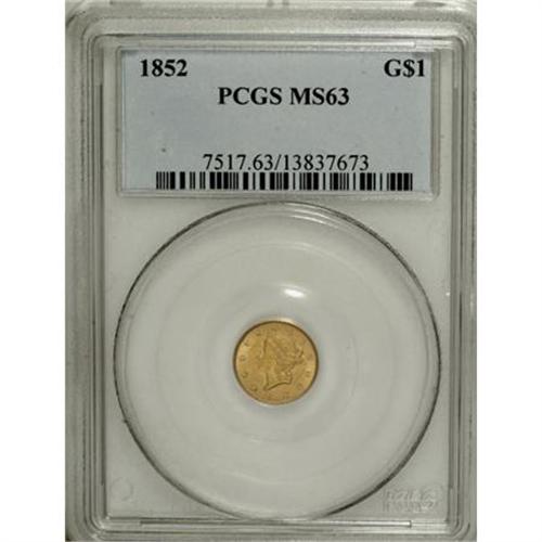 <B>1852 G$1 MS63 PCGS.</B></I> This shimmering green-gold representative is highly attractive for the MS63 level, since the strike is intricate and the original surfaces lack detrimental marks.<BR><I>From The Pearl E. Pemberton Collection.</B></I><BR><BR><B>Coin Engraver:</B> James B. Longacre<BR><BR><b>Shipping:</b> Coins & Currency (<a target="_blank" href="http://www.heritageauctions.com/common/shipping.php">view shipping information</a>)