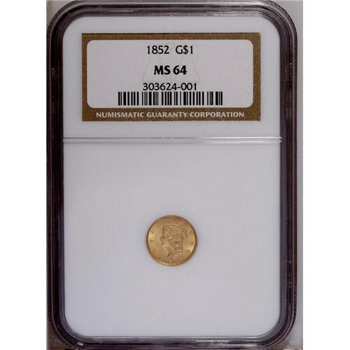 <B>1852 G$1 MS64 NGC.</B></I> A bright and frosty example of this popular issue. A well defined coin, a few light marks account for the grade, but none are individually detracting.