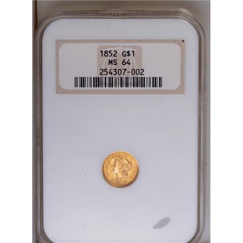 <B>1852<G$1> MS64 NGC.</B></I> Choice and sharply struck with khaki-orange surfaces that are largely mark-free. A subtly lustrous example that would fit well in a type set.