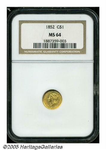<B>1852<G$1> MS64 NGC.</B></I> Lustrous surfaces exhibit a wheat-gold patina and well impressed design features. A few minute grade-defining marks are noted on Liberty's cheek. Population: 223 in 64, 77 finer (5/05).